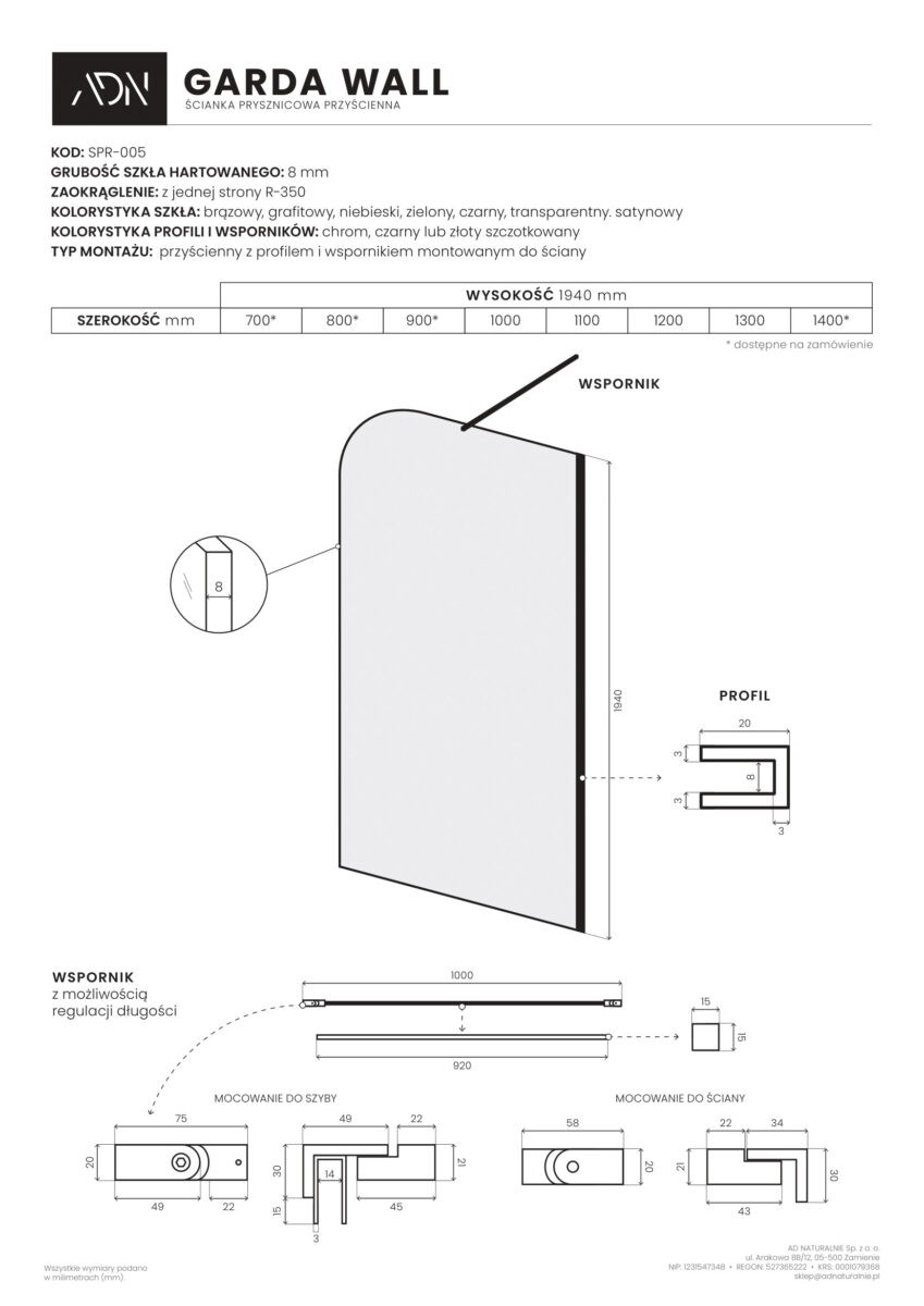 - w komplecie: zestaw montażowy, profil aluminiowy w kolorze, wspornik aluminiowy w kolorze
