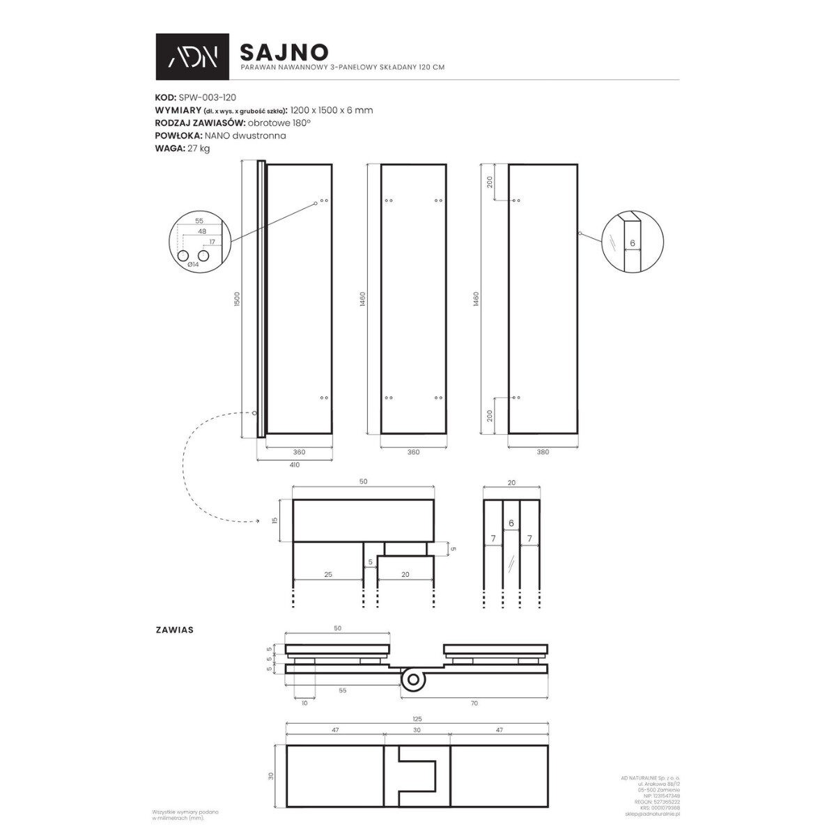 - ilość elementów parawanu: 3-elementowy