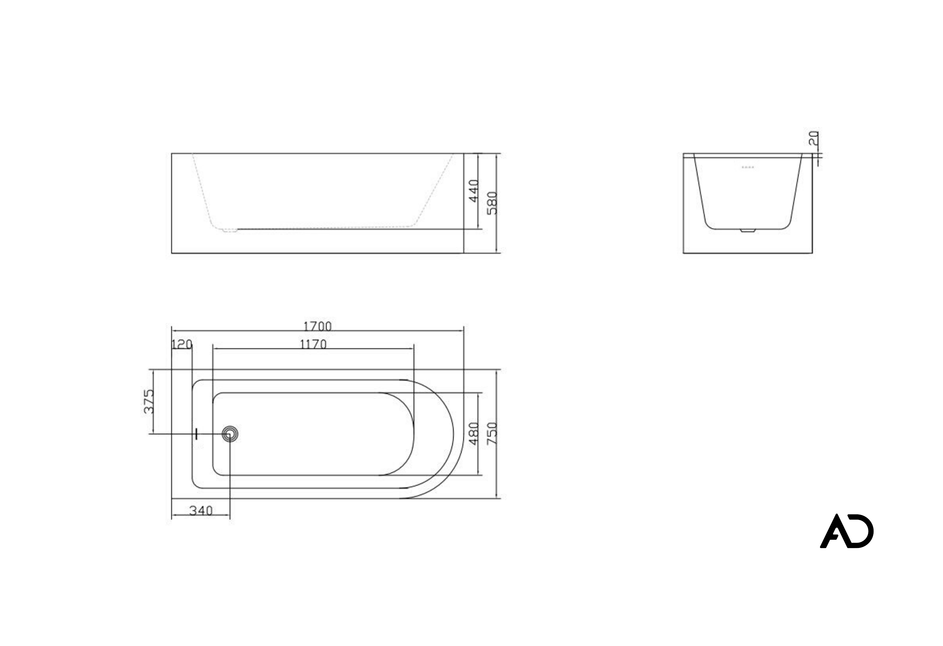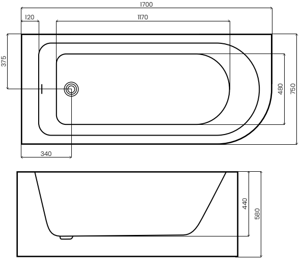 Narożna wanna Upsala 170 cm Ad Naturalnie - wymiary