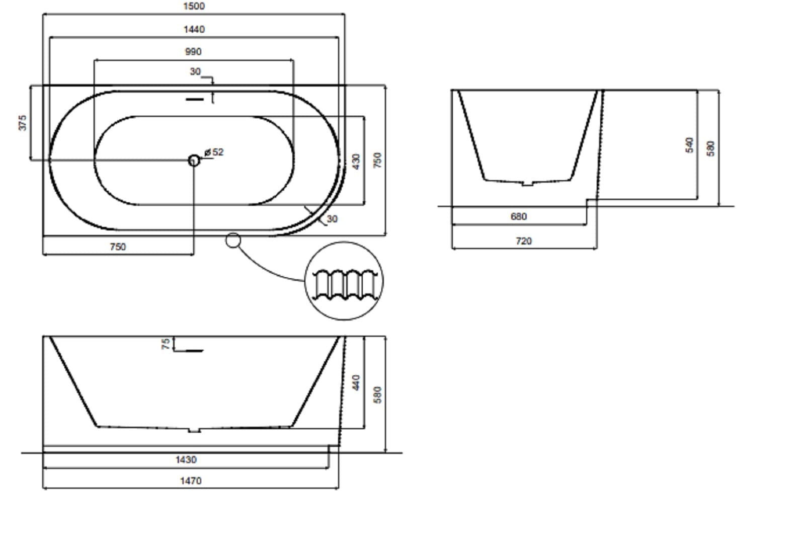 Wanna Denaya wolnostojąca narożna ryflowana #WAS-150-DLW- wymiary