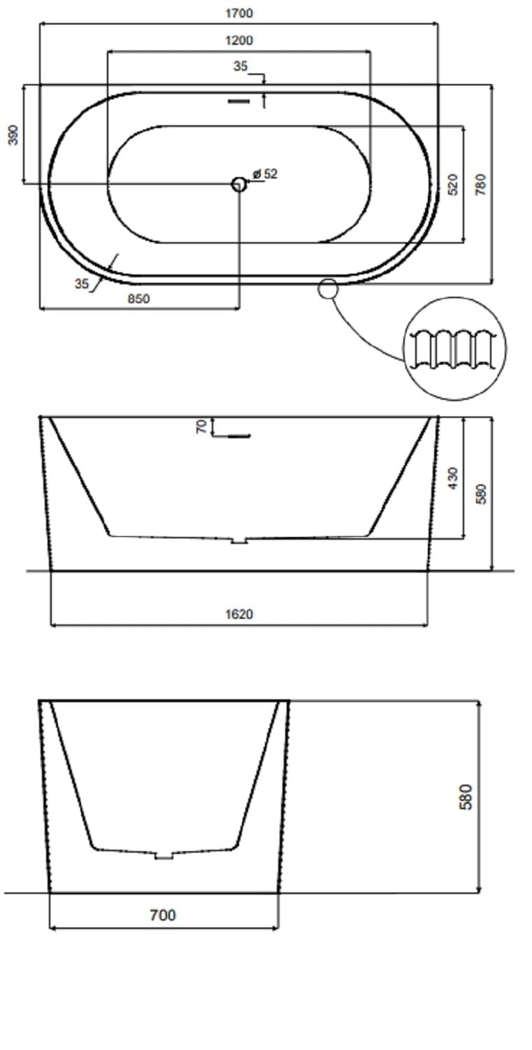 Wanna wolnostojąca ryflowana Besco Leya - wymiary