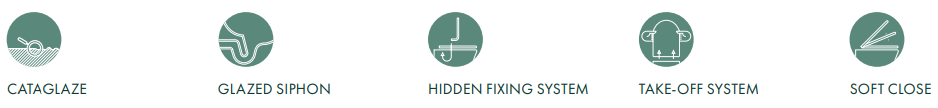 Wyrazista kolekcja włoskiego producenta. Seria zawierająca wiele modeli umywalek oraz dwa modele miski wc standardową oraz krótką miskę wc. Do każdej toalety dopasowany jest odpowiedni bidet. Na uwagę zasługuję mnogość rozwiązań dotyczących umywalek. Catalano Green to szeroki wybór umywalek nablatowych z i bez otworów, umywalek wiszących. Nietypowym rozwiązaniem są umywalki wolnostojące.