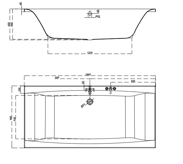 - odpływ na środku wanny (centralny, przy dłuższym boku),