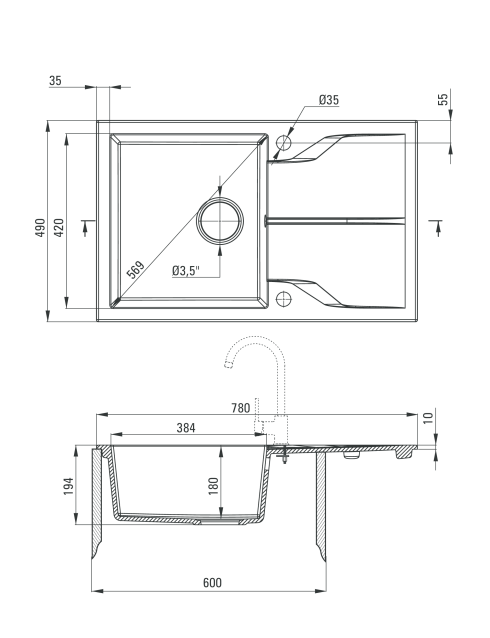 Zlewozmywak granitowy 1-komorowy z ociekaczem - grafitowy, ZQN_2113
