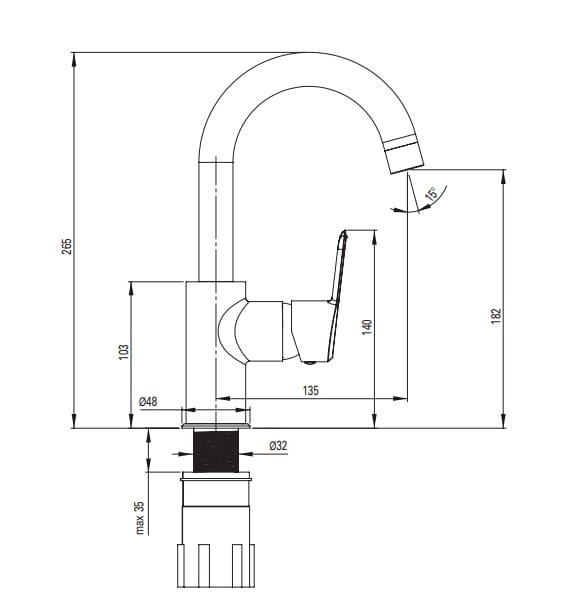 - zasięg wylewki: 135 mm.