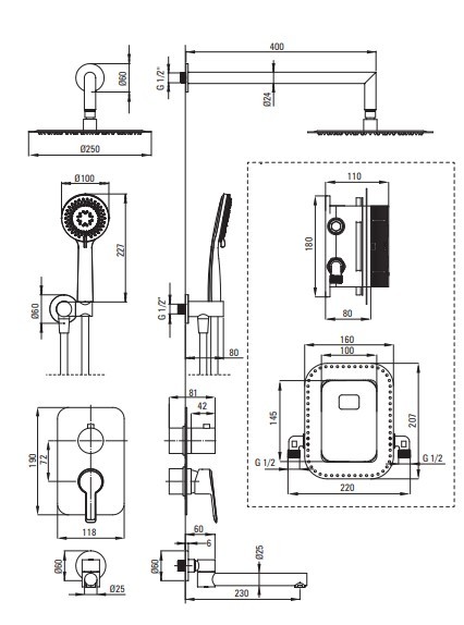 Zestaw Arnika składa się z boxa podtynkowego mieszaczowego, głowicy prysznicowej, ruchomej wylewki i słuchawki prysznicowej z wężem i przyłączem kątowym.