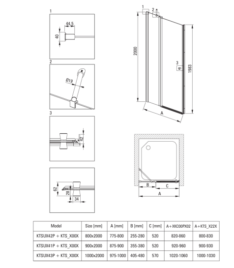 - Montaż: do kompletowania z drzwiami prysznicowymi KTC, do kompletowania z walk-in KTS,