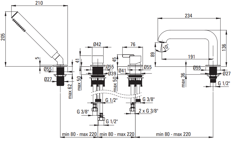 Bateria wannowa 4-otworowa Deante Silia czarny mat BQS_N14M - wymiary