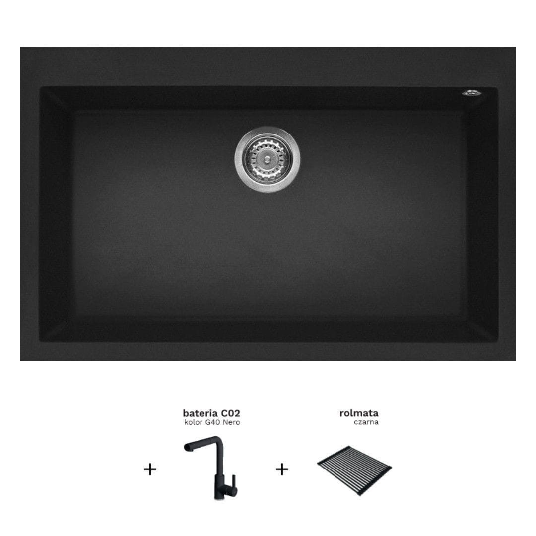 Elleci Quadra 130 Zestaw zlewozmywak wpuszczany 79x50cm + bateria kuchenna C02 + rolmata, kolor czarny (Granitek), LGQ13040SET