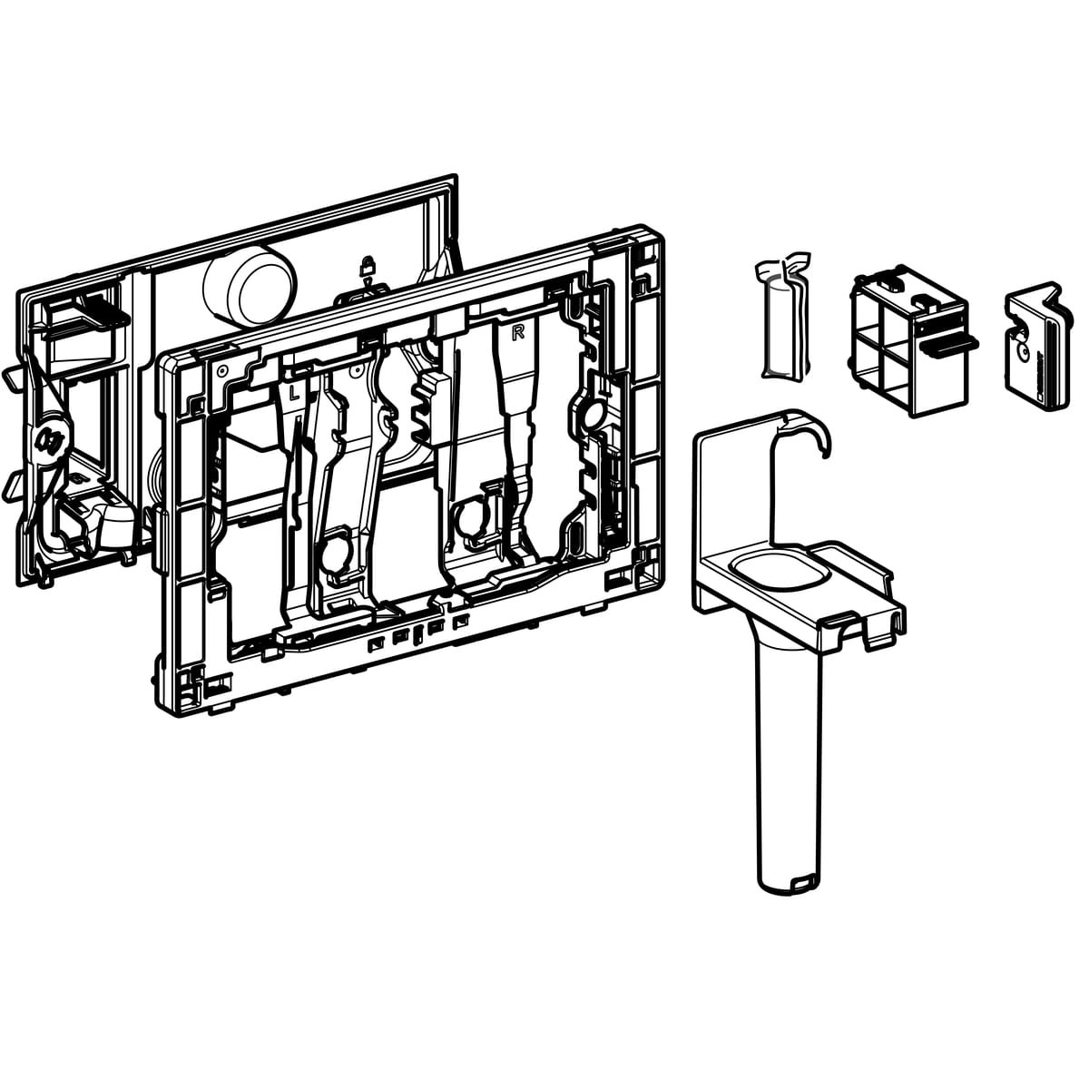 - w zestawie: ramka mocująca z mechanizmem odchylania, płytka ochronna, pojemnik wiszący na kostkę Geberit DuoFresh, szuflada z uchwytem na kostkę Geberit DuoFresh,