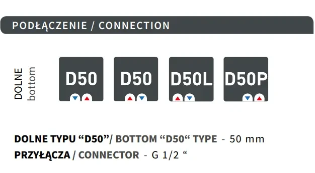 - podłączenie standardowe: dolne 50 mm na środku