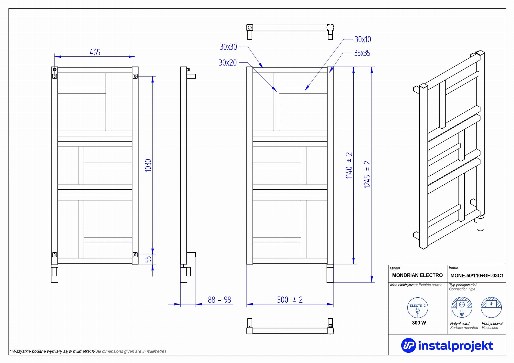 Popularność modelu, jego dekoracyjny charakter zaowocowało włączeniem grzejnika Mondrian do grupy grzejników elektrycznych marki Instal Projekt. Dzięki temu grzejnik Mondrian znajdzie zastosowanie w każdym domu i mieszkaniu. Instal Projekt Modrian Electro wyposażony jest w grzałkę Instal Projekt Hot2 z funkcjami:
