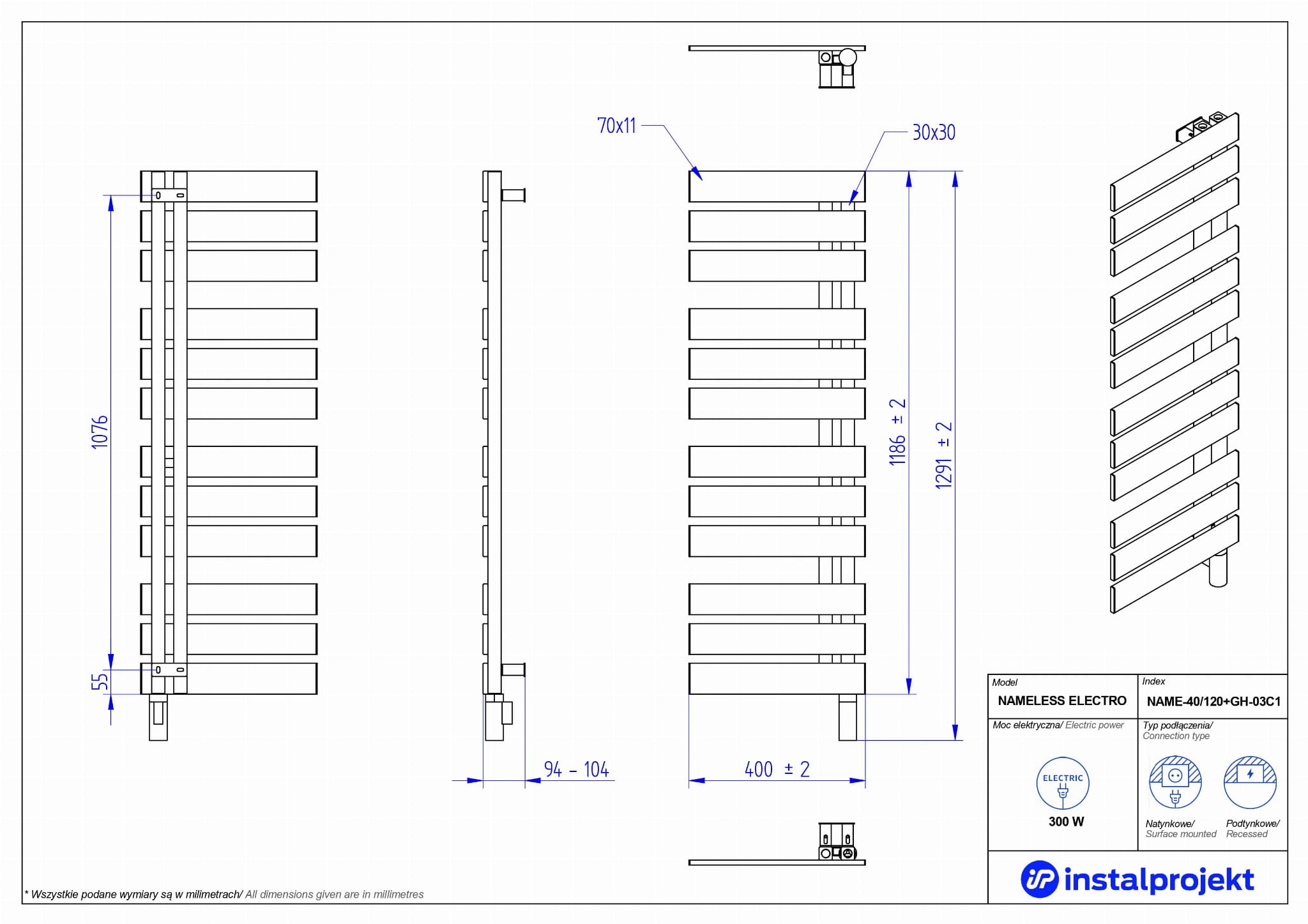 Instal Projekt Nameless Electro grzejnik łazienkowy elektryczny 1186x400mm moc 300W, kolor czarny/black swan NAME-40/120C75+GH-03C2