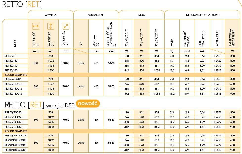 Grzejnik łazienkowy Instal Projekt RETTO (kolor do wyboru z palety Instal Projekt) RET-50/70D50-IP