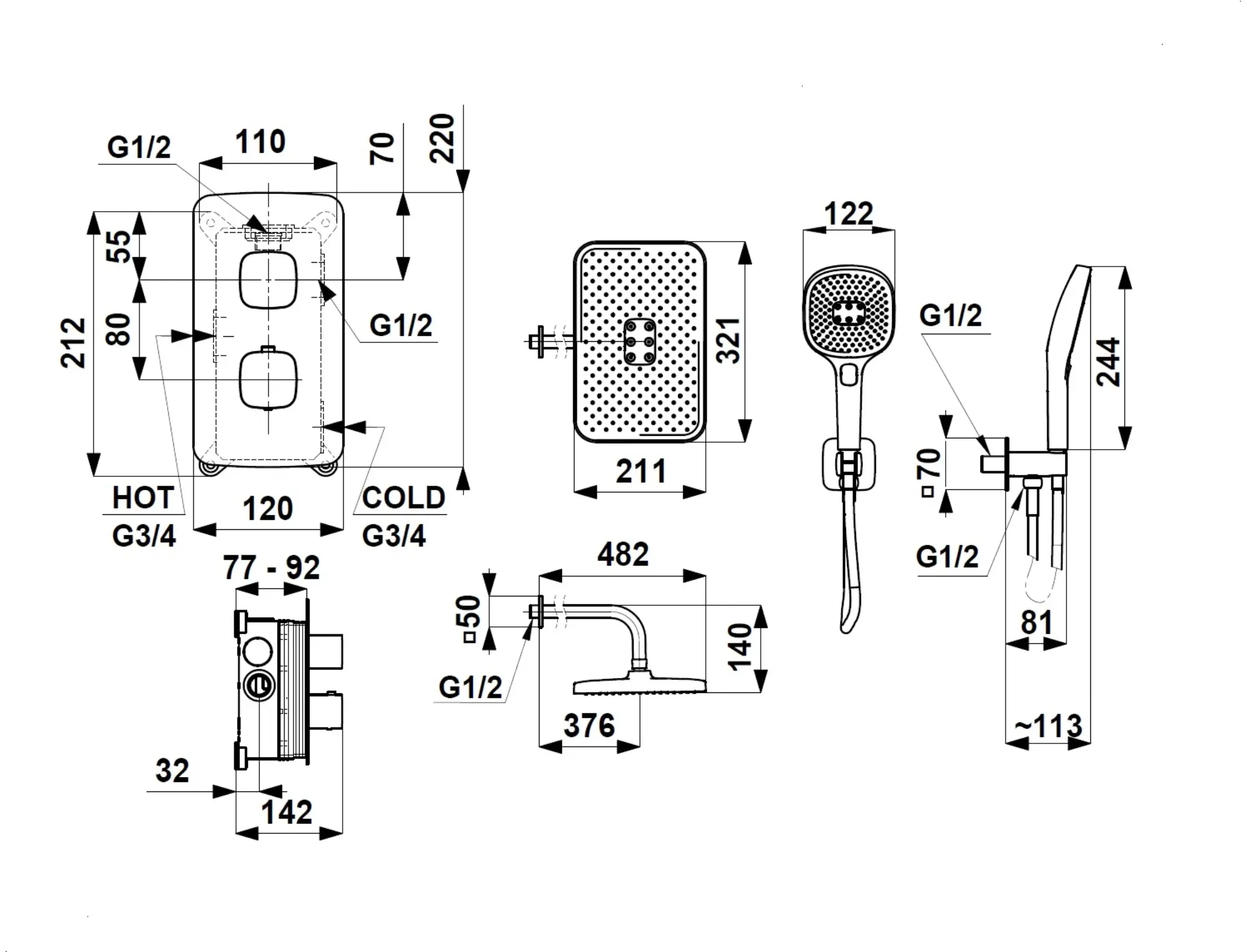 Zestaw natryskowy z termostatem Kfa Malaga kolor grafit metaliczny PVD 5759-501-61- wymiary: