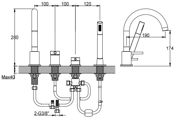Czarna bateria wannowa otworowa Kohlman Axel Black - wymiary