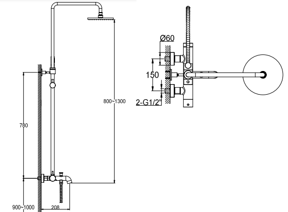 Grafitowa kolumna natryskowa z wylewką Kohlman Axel Gray - wymiary