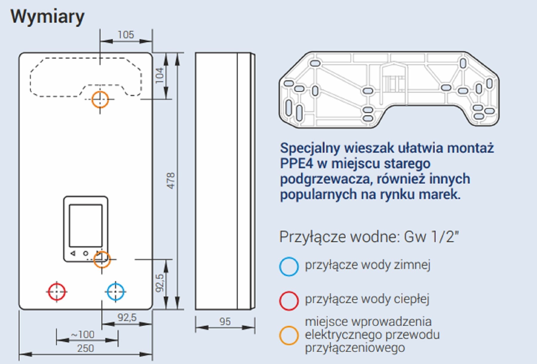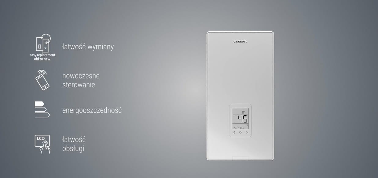 - specjalnie zaprojektowana obudowa PPE4, wyposażona w unikalny wieszak, umożliwia łatwy montaż podgrzewacza w miejscu starego. - Wyświetlacz LCD