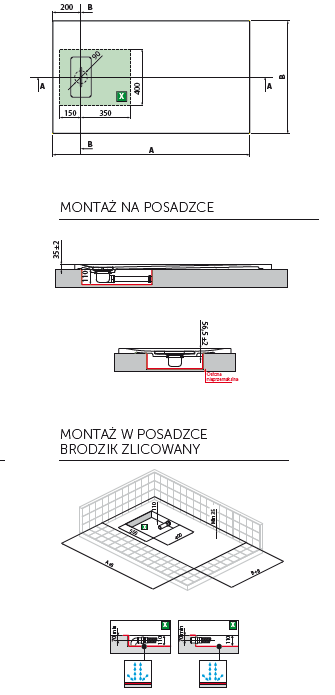 - Montaż: bezpośrednio na posadzce lub na nóżkach,