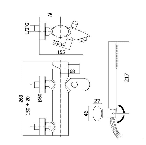 Paffoni BERRY bateria wannowa ścienna z zestawem natrsykowym, kolor chrom, BR023CR