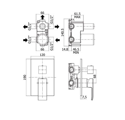 - głębokość zabudowy elementu podtynkowe (min/max): 46,5mm - 61,5mm