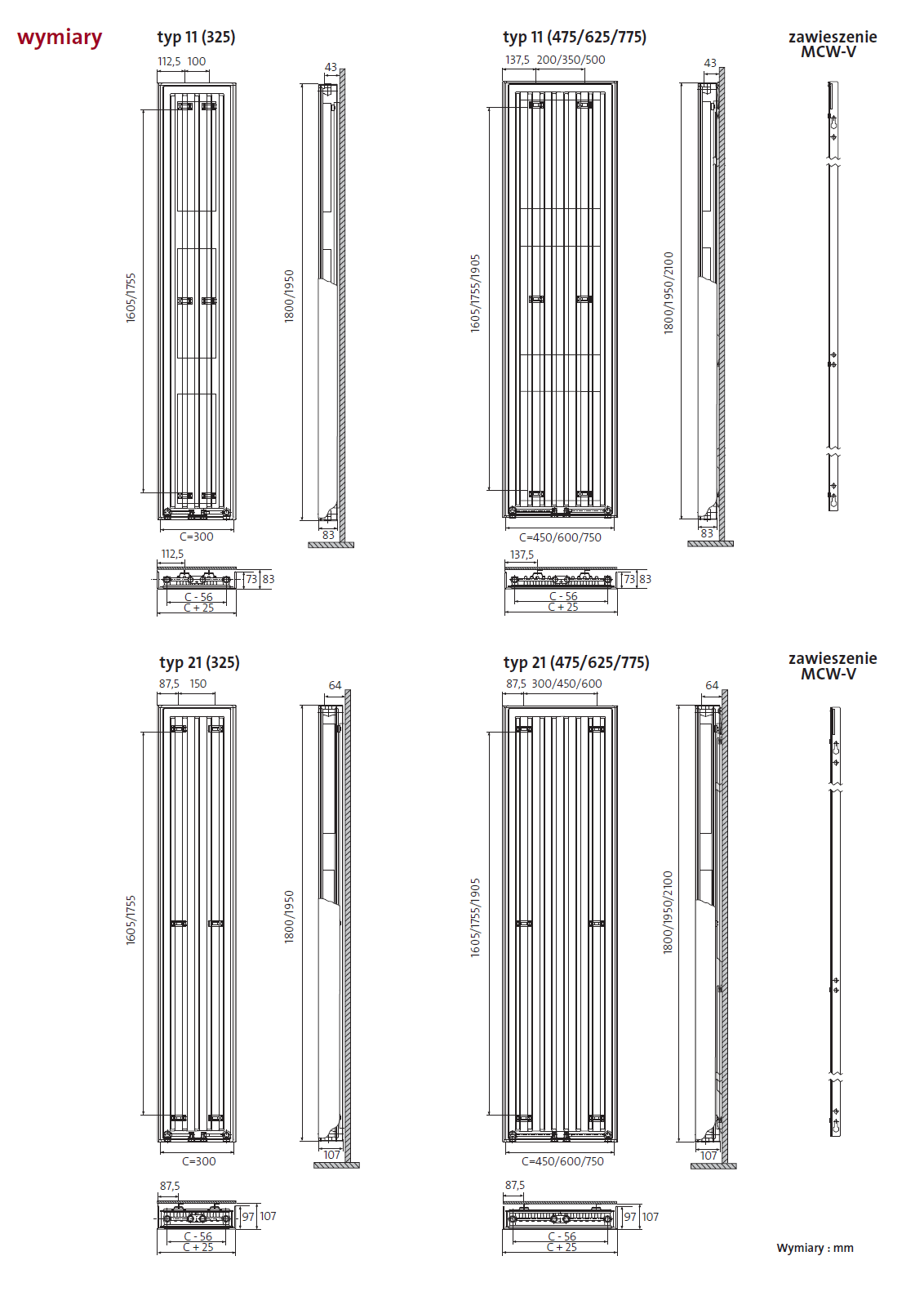 - wyposażenie podstawowe: zawieszenia MCW-V, korki, odpowietrznik w komplecie z grzejnikiem