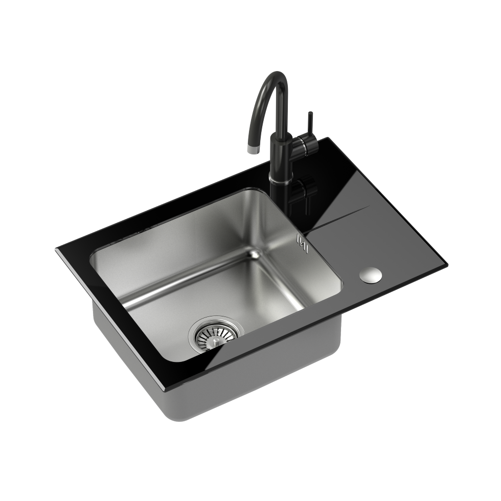 Quadron Hugh 116 komora stalowa z czarnym blatem szklanym z syfonem i zaślepką (640x440/R35) + Naomi SteelQ stalowa bateria kuchenna czarny połysk ST3564SC1BS-BW7059CZP