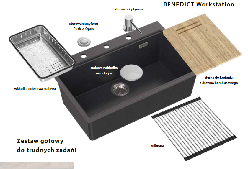 Benedict Workstation od Quadron to zlew kompletny. Jedna, duża 80 cm komora o dużej 22 centymetrowej głębokości stwarza nieograniczone możliwości. Zlew wykonany z GraniteQ Hard Rock. Materiał jest naturalnego granitu i włókien szklanych.