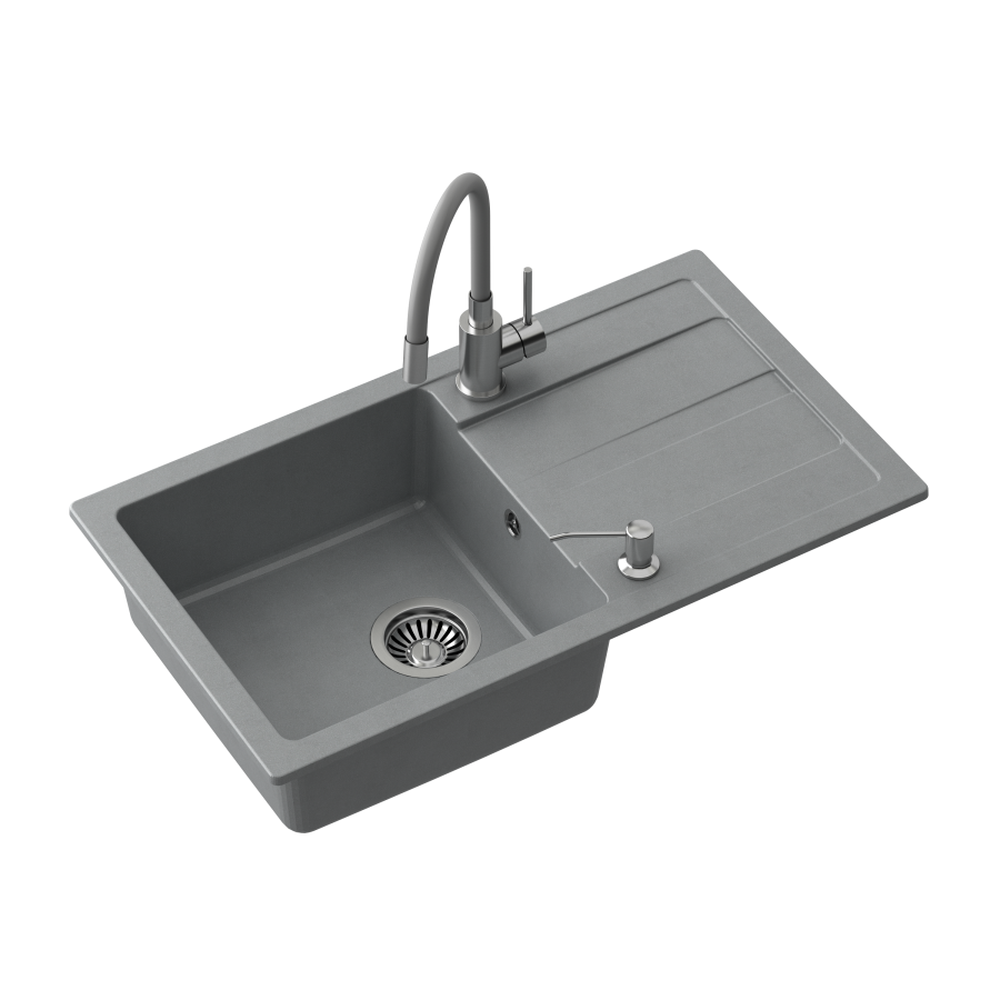 Quadron READY- MAX SZARY zlewozmywak granitowy 1-k z/o (77x44x17,5) + bateria z elastyczną wylewką + dozownik stalowy + syfon TQ7744RMSZ