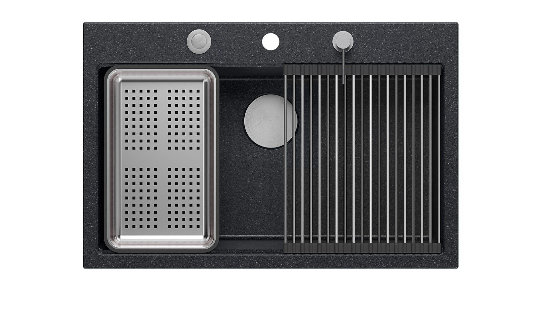 Benedict Workstation od Quadron to zlew kompletny. Jedna, duża 80 cm komora o dużej 22 centymetrowej głębokości stwarza nieograniczone możliwości. Zlew wykonany z GraniteQ Hard Rock. Materiał jest naturalnego granitu i włókien szklanych.