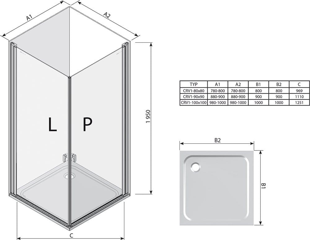 - wymiary kabiny (2 x CRV1-90): 880 - 900 x 880 - 900 x 1950 (mm),