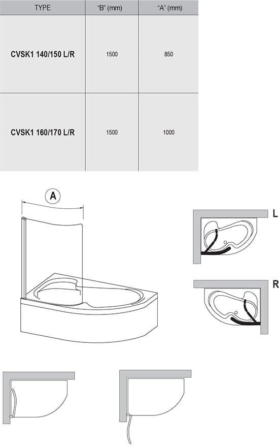 Chrome CVSK1 to jednoelementowy parawan nawannowy z obrotowym słupkiem, który pozwala na złożenie go w zakresie 180° na ścianę lub do wnętrza wanny. Prawan zalecany jest do montażu z wannami asymetrycznymi z serii Rosa I, Rosa II oraz Rosa 95.