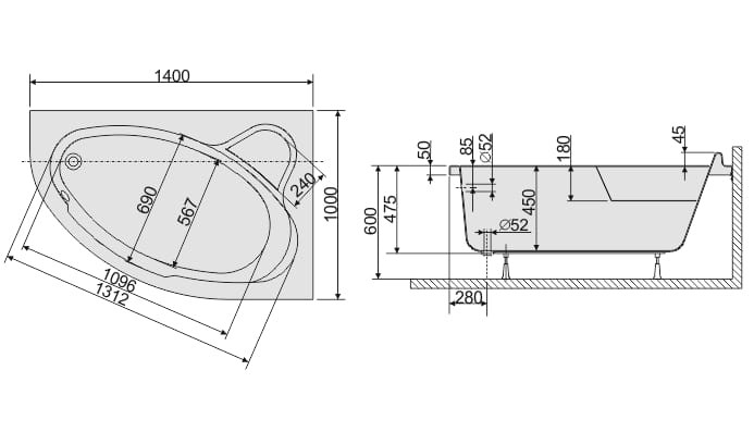 Wanna asymetryczna Sanplast COMFORT biała 100 x 140 cm (610-060-0200-01-000)
