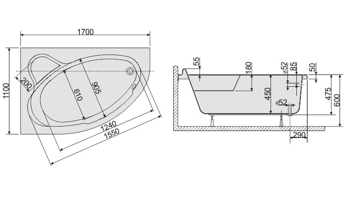- Kształt wanny: asymetryczna