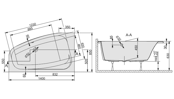 Wanna asymetryczna lewa WAL/FREE 85x140+ST26 biew