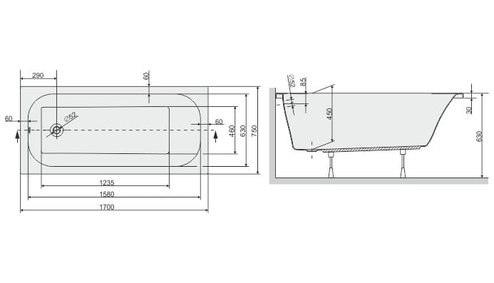 Wanna prostokątna Sanplast FREE LINE akrylowa, odpływ z boku, biała, 75 x 170 cm, WPdo/FREE 75x170, 610040017001000