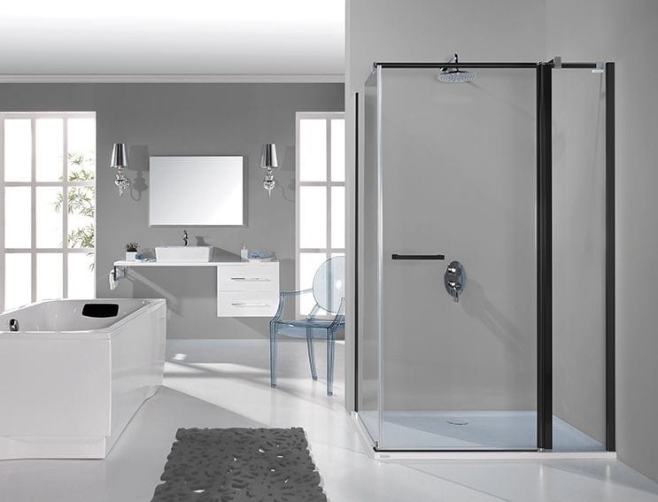 Nowoczesne kabiny prysznicowe narożne kwadratowe lub prostokątne z drzwiami skrzydłowymi oraz ścianką stałą KNDJ2/PRIII posiadają wypełnienie z bezpiecznego szkła hartowanego o grubości 6 mm. Konstrukcja o wysokości 195 cm wyposażona jest w drzwi z mechanizmem unoszenia zapewniającym wygodne otwieranie i szczelne zamykanie kabiny, uszczelkę magnetyczną, zamocowane na dolnych krawędziach drzwi transparentne uszczelki oraz chromowaną listwę. Wszystko to zapewnia odprowadzenie wody z powierzchni szkła wewnątrz kabiny i zabezpiecza przed rozpryskiwaniem poza jej obszar. Wygodne otwieranie drzwi umożliwia funkcjonalny chromowany uchwyt w kolorze profili. Regulowane profile przyścienne pozwalają na zniwelowanie krzywizny ściany. Kabiny posiadają chromowane wsporniki stabilizujące ich konstrukcję. Produkty są uniwersalne – możliwość montażu w wersji lewej lub prawej.