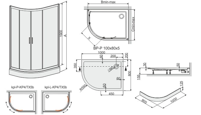 - w zestawie: kabina prysznicowa, brodzik z obudową, syfon i nóżki do brodzika