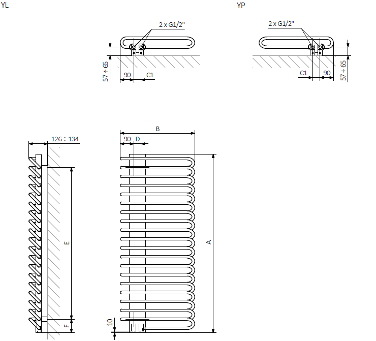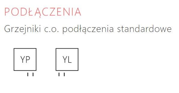 - podłączenia YL, YP – podłączenia dolne z boku o rozstawie 5 cm, dwa otwory w grzejniku.