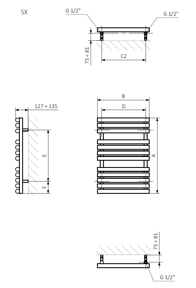 - podłączenie SX – standardowe podłączenie dolne o rozstawie zależnym od wymiarów grzejnika. Najczęściej 3 cm mniej niż szerokość grzejnika,