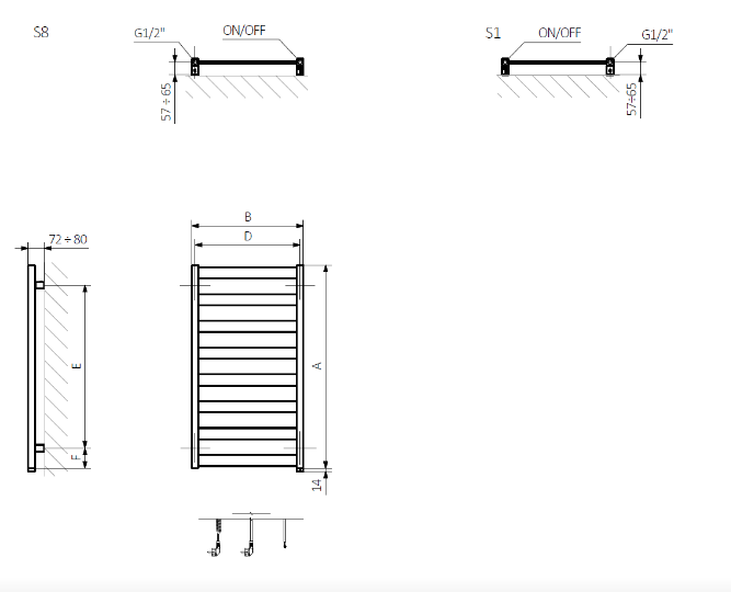 - podłączenia O1, O8 – podłączenie dolne z boku o rozstawie 5 cm (50mm). Z uwagi na tylko jeden otwór w grzejniku należy zastosować zawór z rurką zanurzeniową,