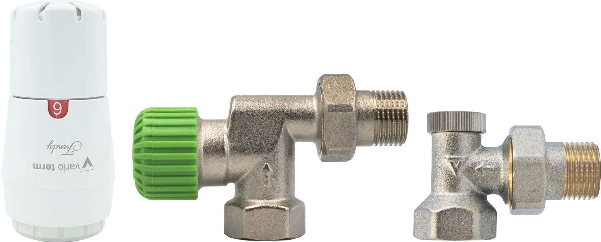 - w komplecie: zawór termostatyczny kątowy aksjalny, zawór odcinający kątowy, głowica termostatyczna Trendy (Gwint: M30x1,5)
