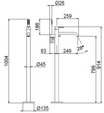Czarna bateria wannowa stojąca V27190/CZAR - wymiary