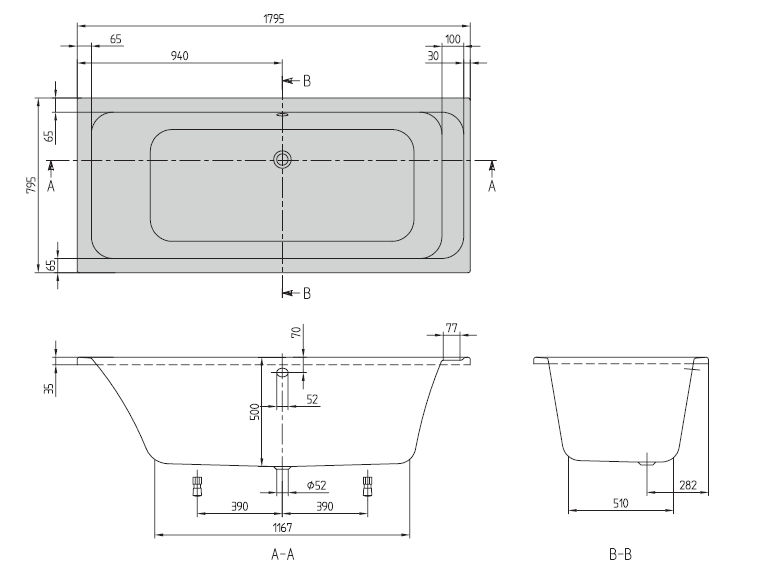 - Odpływ: na środku wanny,
