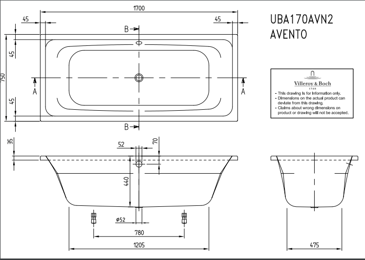 Wanna Villeroy&Boch Avento 170x75 cm UBA170AVN2V-01 - cechy produktu:
