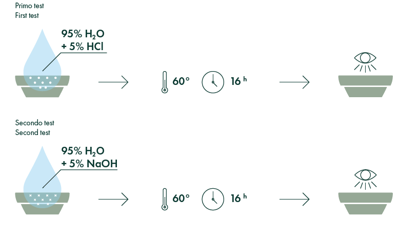 #2 Odporność chermiczna- Test odporności na środni chemiczne. Zarówno szkliwiona i matowiona powłoka misek i bidetów Catalano Colori poddawana jest niezwykłemu testowi odporności. Priodukty zanurzane są w 5% roztworze kwasu chlorowodorowego. Kolejny etap to oddziaływanie na produkty 5% roztworem wodorotlenku sodu.